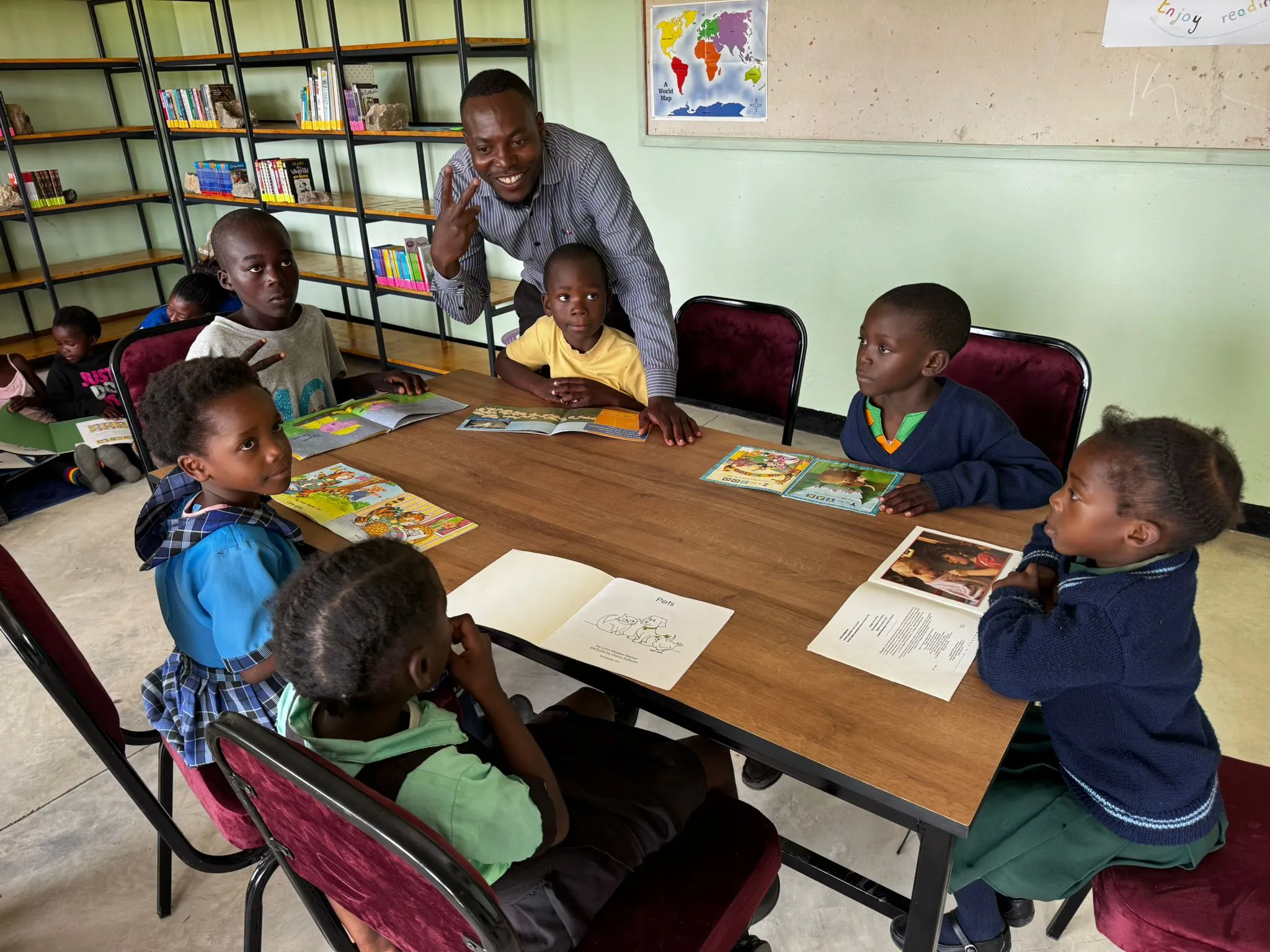 Von diesem Betrag wurde u.a. eine Bibliothek mit Mobiliar und Büchern in Sambia eingerichtet und in Betrieb genommen (Foto).