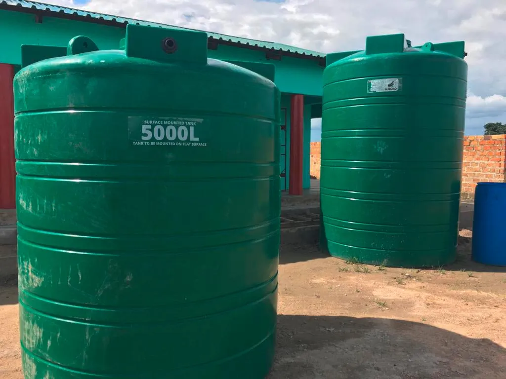 Richtig! Ab sofort hat die Schule dank einer im Januar veranlassten Bohrung einen eigenen Brunnen, der auch während der Trockenzeit die Wasserversorgung sicherstellt. Das Wasser wird aus dem Brunnen in große Wassertanks gepumpt. Durch die Lagerung der Tanks auf dafür vorgesehenen Gerüsten kann das Wasser dann ohne weiteren Energiebedarf durch die Wasserleitungen der Schule laufen.