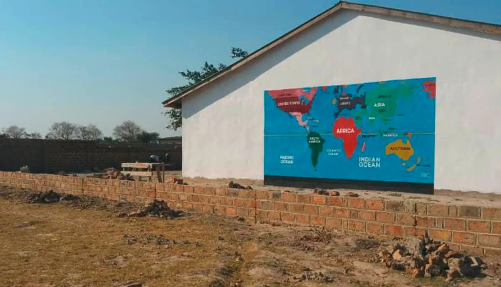 Auch der Außenbereich der Schule nimmt täglich mehr und mehr Form an. Der Schulhof ist nun vollständig von einer Mauer umzogen, um den Kindern einen geschützten Raum zum Lernen und Spielen zu sichern. Die Säulen der Mauer wurden von einem lokalen Künstler, der auch das Schulgebäude mit einer Weltkarte dekoriert hat, mit bunten Zahlen und Zeichen verziert.